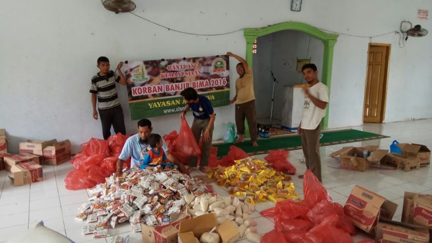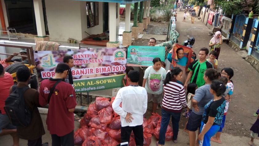 Depsos Al-Sofwa, Belum hilang duka mendalam yang melanda saudara-saudara kita yang berada di Pidie Jaya Banda Aceh akibat gempa bumi, kini musibah menerpa kembali saudara – saudara kita yang berada di kota Bima NTB. Hujan deras yang melanda kota Bima membuat sungai yang berada di sana tidak mampu lagi menampung besarnya debit air serta ditambahnya air laut yang sedang naik sehingga membuat ratusan rumah rusak berat serta ribuan rumah rusak ringan dan ribuan orang mengungsi ke tempat yang lebih aman.