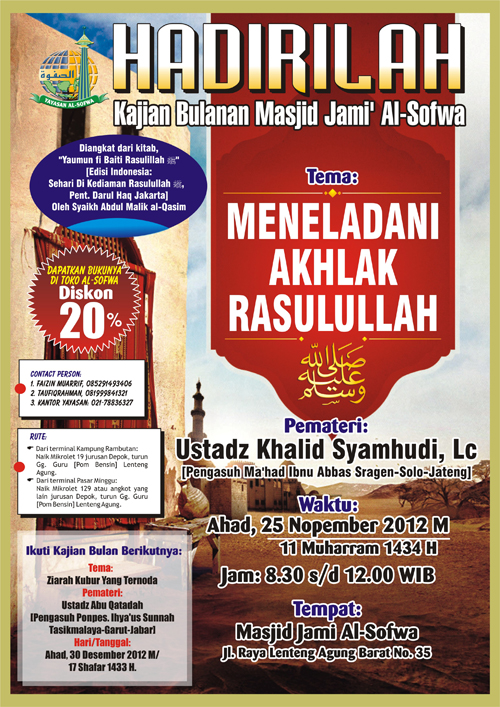 Kajian Bulanan Masjid Jami' Al-Sofwa- Meneladani Akhlak RasulullahMayoritas kaum Muslimin pada hari ini terjebak di antara dua sikap yang kontradiktif terhadap Rasulullah Shallallahu ‘alaihi Wasallam. Ada yang berlebih-lebihan terhadap beliau hingga terseret ke dalam perbuatan syirik, seperti memohon kepada beliau atau ber-istighatsah kepadanya, dan ada pula yang memandang remeh kedudukan beliau selaku utusan Allah Subhaanahu wata’aalaa, hingga ia berani melanggar petunjuk beliau, tidak meneladani sirah beliau, dan tidak pula menjadikannya sebagai pelita kehidupan dan rambu perjalanan.