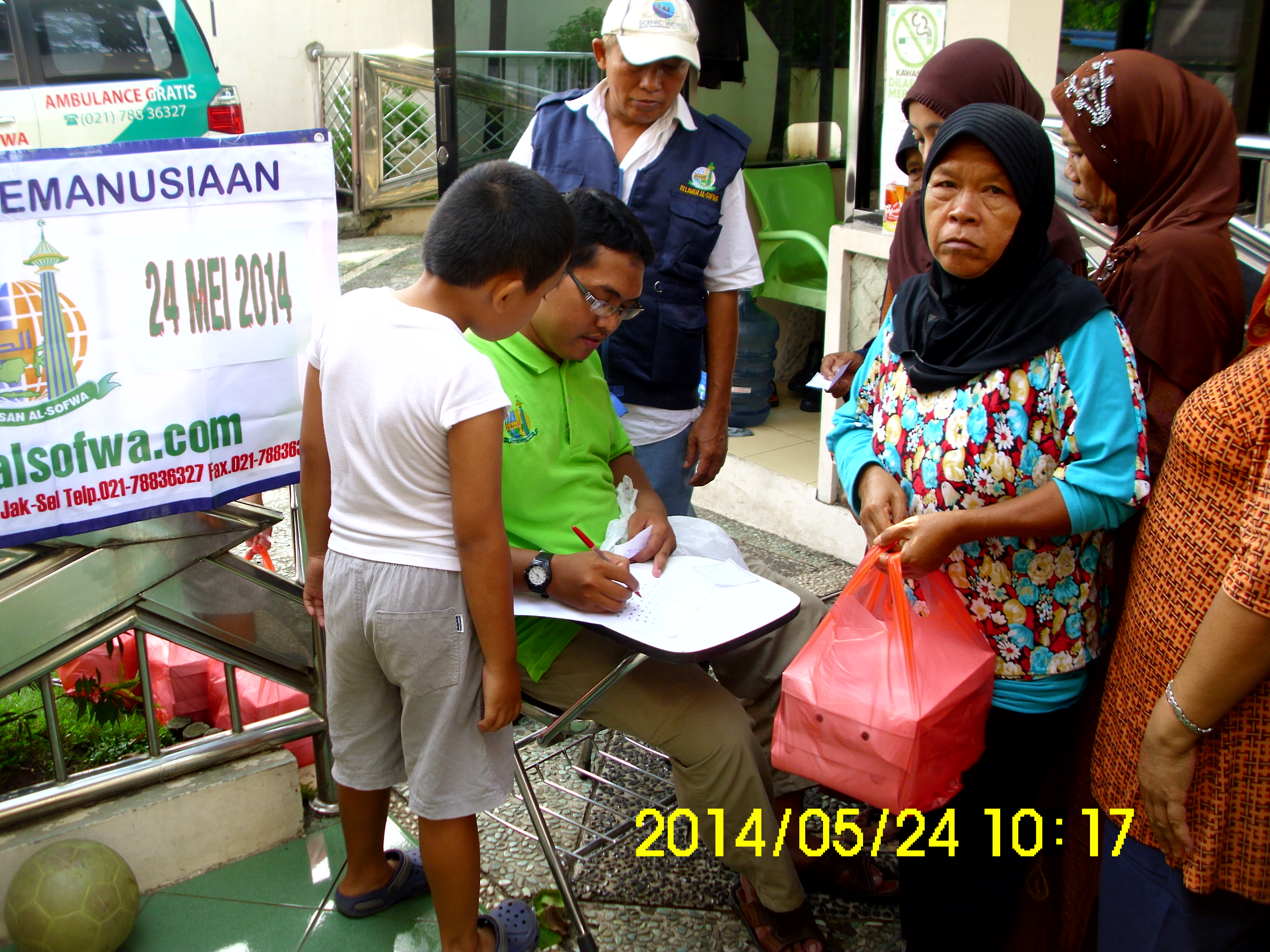 Depsos Al-Sofwa, Sabtu (24/5/14) Yayasan Al-Sofwa mengadakan kegiatan pembagian fidyah dan kaffarat untuk fakir dan miskin di Masjid Jami’ Al-Sofwa. Kegiatan yang dimulai pukul 10 pagi mengundang sebanyak 50 KK dari warga Rt.011/01 dan warga Rt.007/01 kelurahan Lenteng Agung.