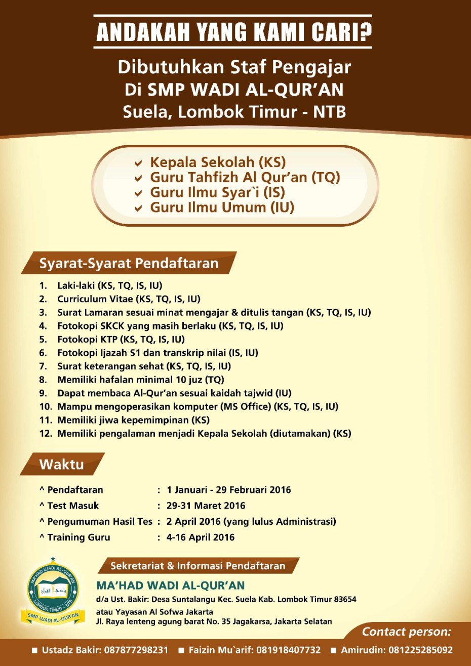 Rekrutmen Staf Pengajar di SMP Wadi Al-Qur’an Lombok Timur NTB Posted by admin | Jan 14, 2016 | Arsip Maklumat | 1 | Keterangan: Cara mengunduh / mendownload Brosur Rekrutmen Staf Pengajar di SMP WADI AL-QUR’AN Lombok Timur NTB, klik kanan lalu klik “save image as…” atau “simpan gambar sebagai…” Telah Dibaca: 533