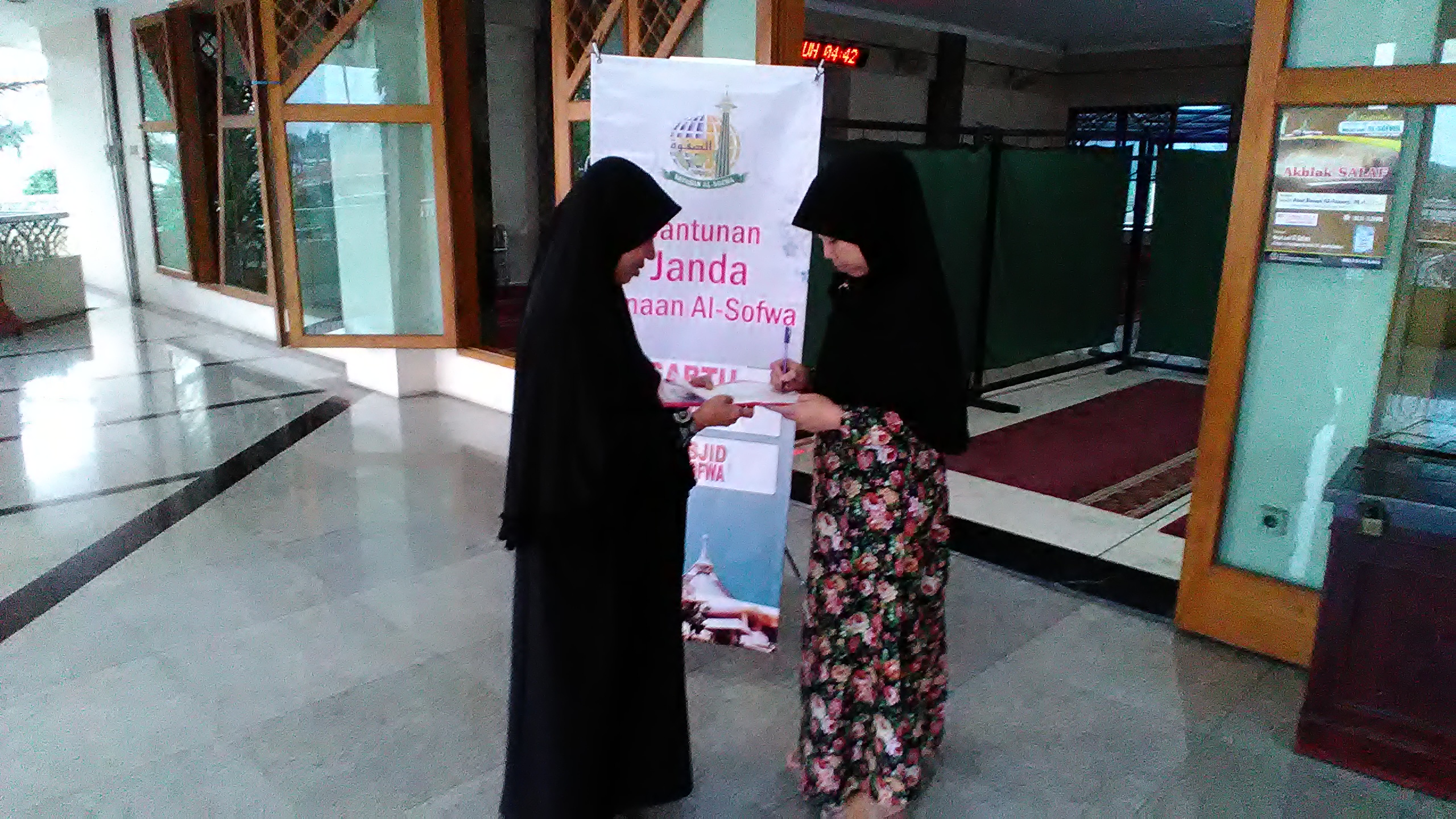 Depsos Al-Sofwa Sabtu (11/3) Sebayak 35 janda binaan Al-Sofwa menerima santunan sebesar Rp. 200.000,- / kepala, dalam kegiatan “Santunan Janda Binaan Al-Sofwa”, yang mana acara tersebut diadakan berbarengan dengan kajian rutin janda binaan Al-Sofwa pada setiap hari sabtu. Kegiatan santunan dimulai pukul 17.00 setelah para peserta santunan mengikuti kegiatan pengajian dengan materi membaca Al-Qur’an dan Iqra yang benar serta diiringi dengan hafalan doa-doa sehari-hari dan surat pendek yang dipandu oleh Ustadzah – Ustadzah berpengalaman.