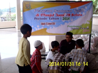 Depsos Al-Sofwa, Pada hari jum’at ( 31/1/2014 ) seperti biasa pada setiap bulannya Yayasan Al-Sofwa mengadakan acara kegiatan santunan yatim yang dihadiri oleh sebanyak 50 yatim yang tinggal di sekitar wilayah Yayasan Al-Sofwa, tidak hanya memberikan santunan saja, Yayasan Al-Sofwa pun memberikan pembinaan baik kepada Ibu / Wali yatim maupun kepada para yatim binaan Yayasan Al-Sofwa.