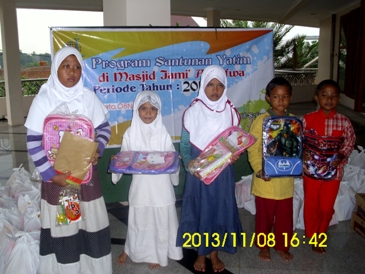 Depsos Al-Sofwa – Cuaca sore 8 November 2013 saat itu mendung, tapi tidak menghalangi para yatim binaan Yayasan Al-Sofwa yang berjumlah 50 anak untuk menghadiri santunan yatim ke- 10, yang seharusnya diadakan pada bulan Oktober bulan lalu dikarenakan panitia pelaksana belum siap mengadakannya disebabkan sedang mengurusi laporan kegiatan qurban, sehingga santunan diadakan pada bulan November.