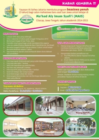 Yayasan Al-Sofwa Jakarta membuka program beasiswa penuh (3 tahun) bagi calon mahasiswa baru asal luar Jawa untuk belajar di Ma’had Aly Imam Syafi’i (MAIS) Cilacap, Jawa Tengah, tahun akademik 2014-2015.